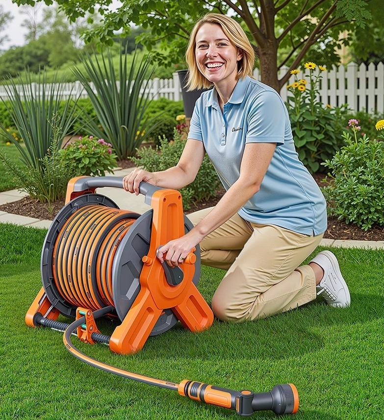 This hose reel can be mounted on the wall, which effectively frees up valuable floor space in your garden, garage, or yard, keeping the area tidy and organized.