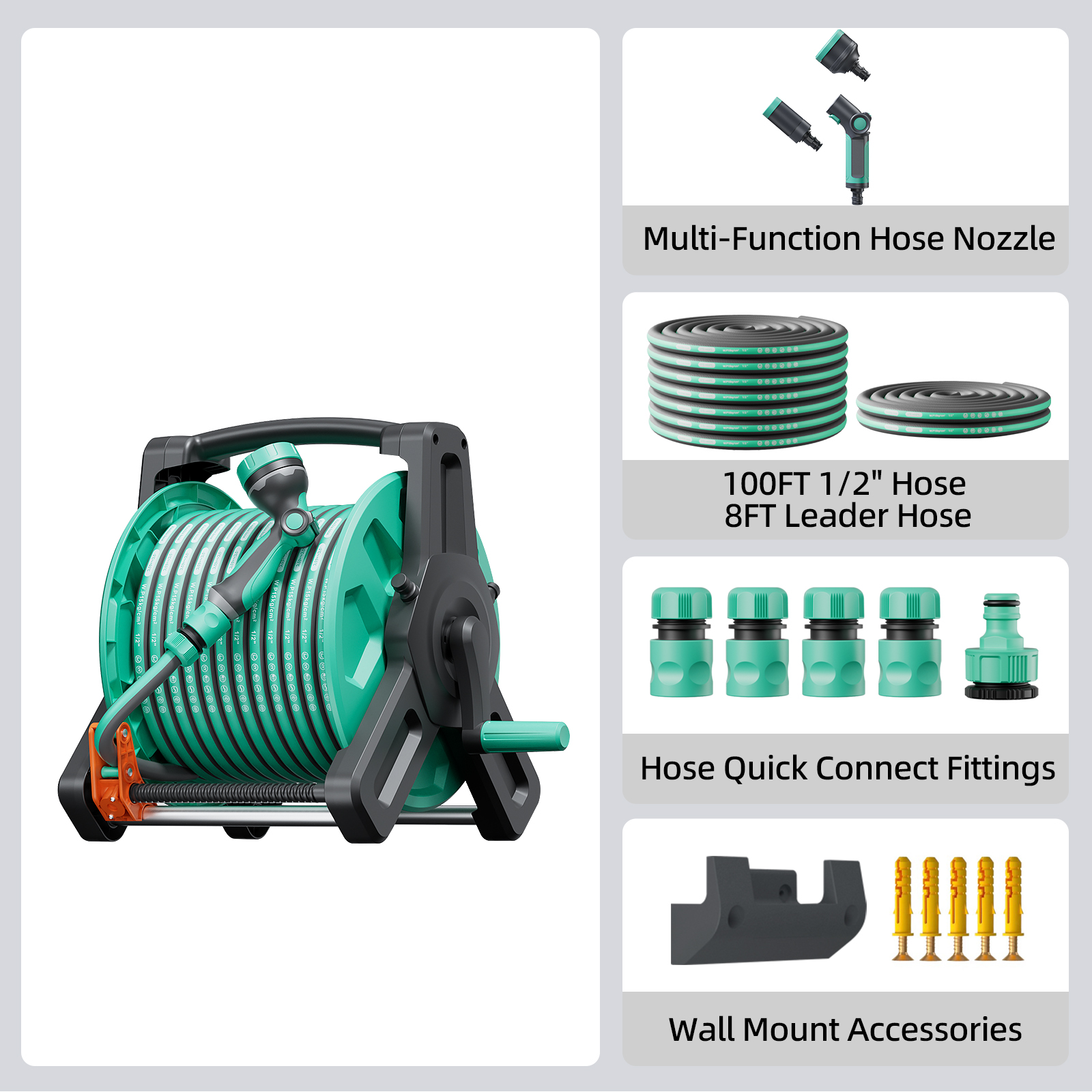 Component: Hose Reel Rack + PVC Hose + Connector Set + Water Gun