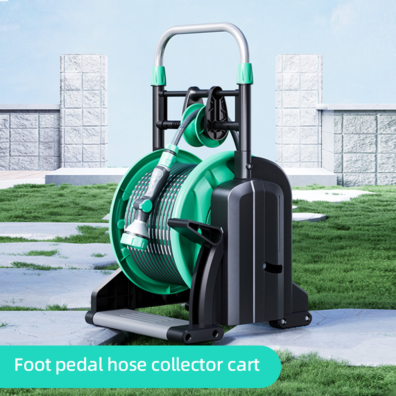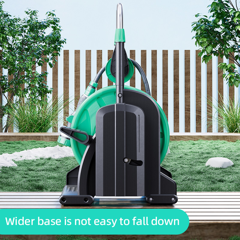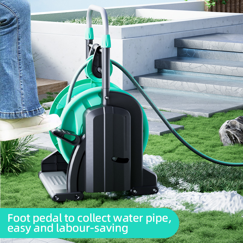 The pedal design hose reel trolley with guide rail can manage and store hose perfectly. - Rewind hose with guide rail